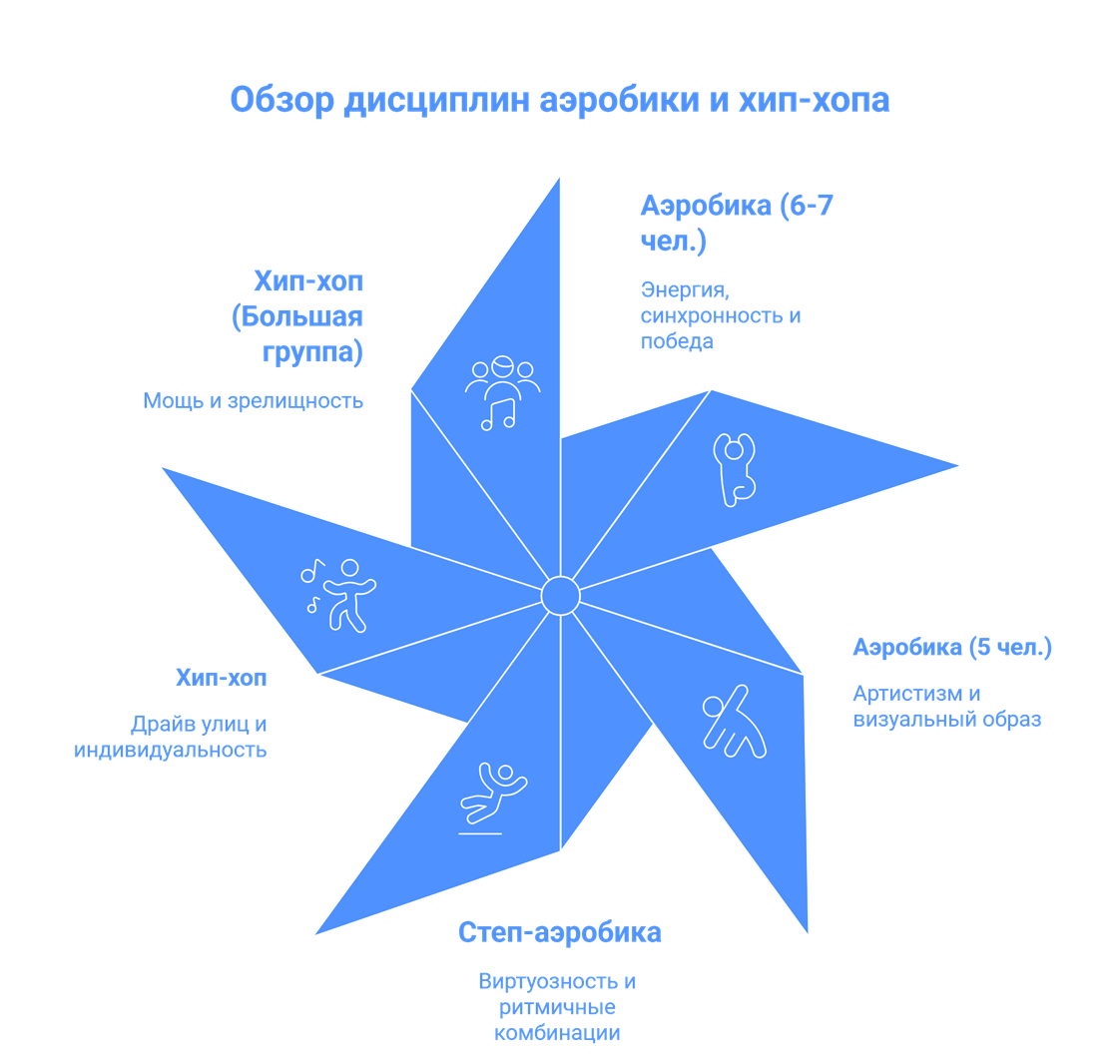 Фитнес-аэробика — это не один вид спорта, а целая вселенная! Здесь каждый найдет свое призвание: от безупречного синхронного исполнения до творческого танцевального шоу, от виртуозной работы на степ-платформе до зажигательных ритмов хип-хопа. Каждая дисциплина — это уникальный микс хореографии, физической нагрузки, командного духа и эмоций.