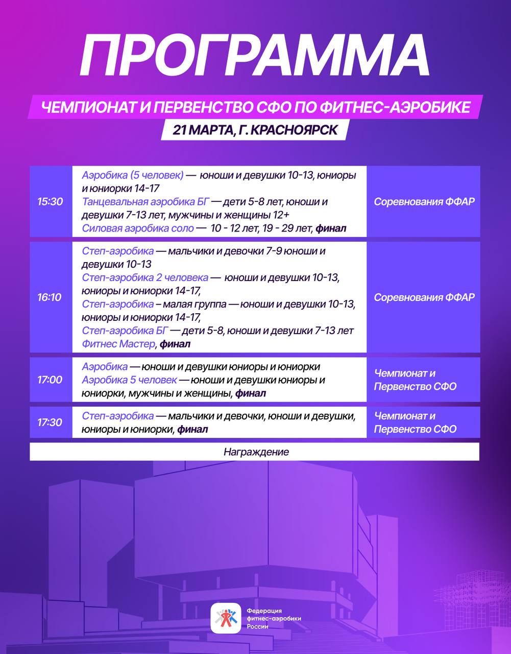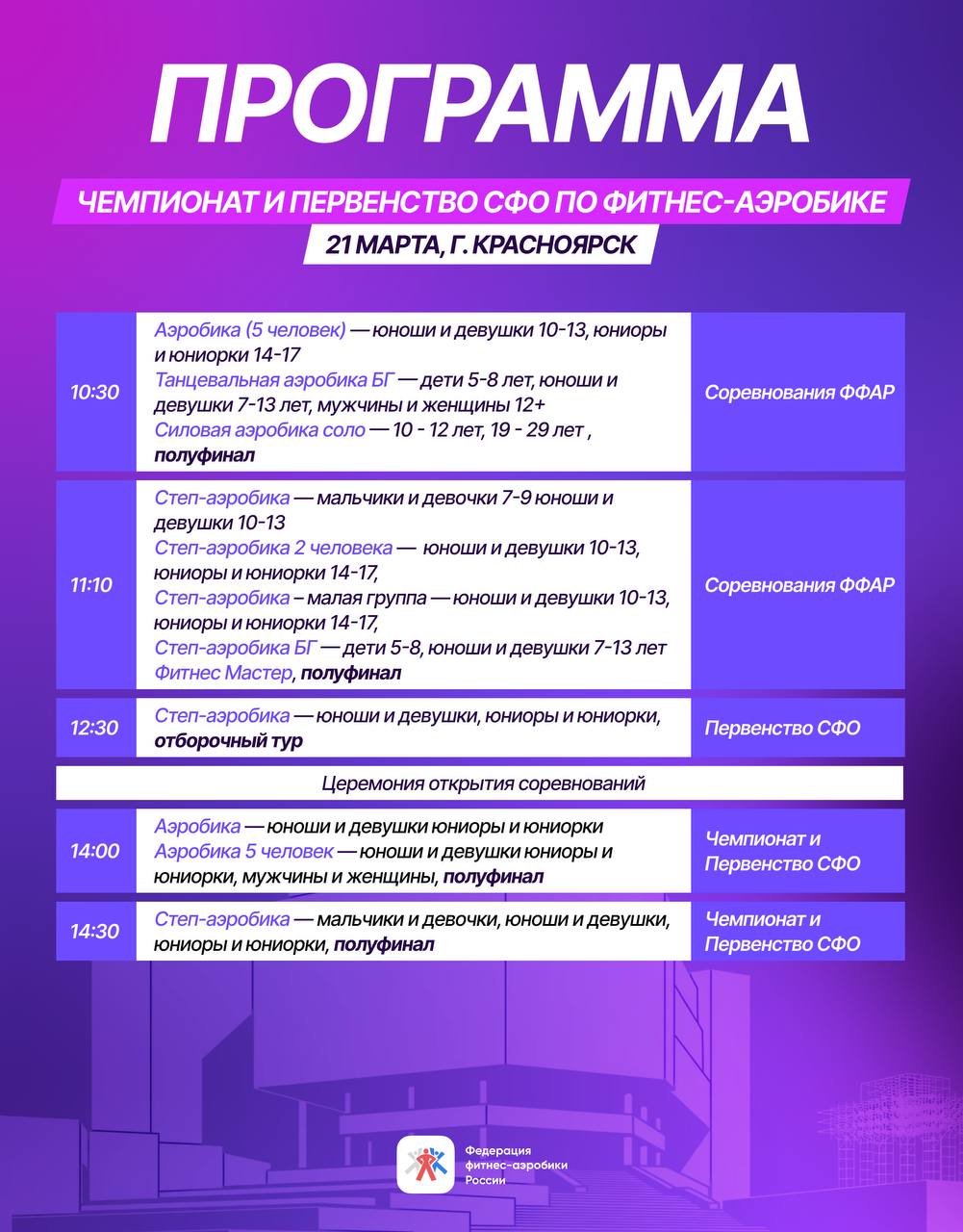 Смотрите, кто выступает, готовьтесь болеть и следить за прямой трансляцией с 10:30 по Красноярску (6:30 по Москве)!