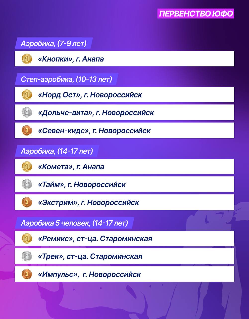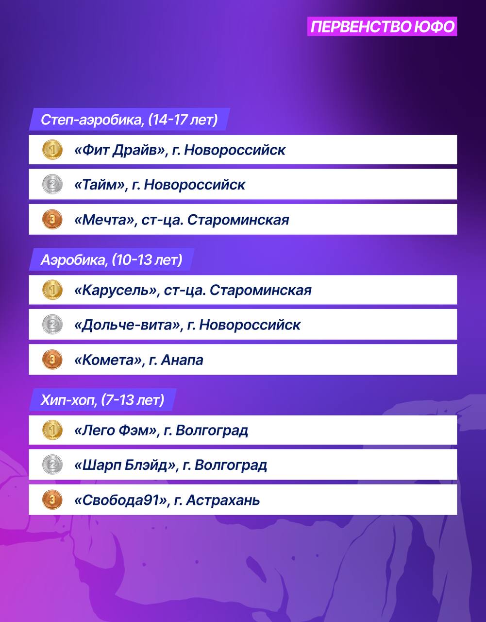 В Супсехе также завершились Чемпионат и Первенство ЮФО по фитнес-аэробике.Спортсмены из разных регионов округа представили свои программы и поборолись за медали.