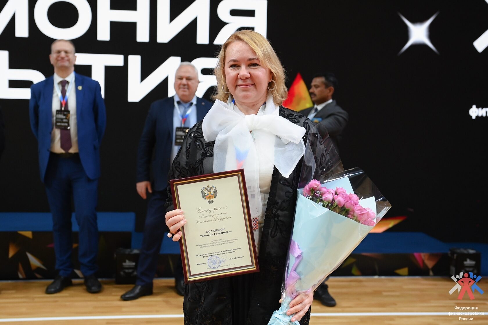 В рамках церемонии открытия Директор Центра спортивной подготовки спортивных сборных команд Российской Федерации Гришин Роман Сергеевич поприветствовал всей участников и гостей соревнований, а также вручил «Благодарность от Министерства спорта Российской Федерации за существенный вклад в развитие физической культуры и спорта» Полухиной Татьяне Григорьевне, президенту Федерации фитнес-аэробики России и Максимовой Олесе Владимировне, президенту московской федерации фитнес-аэробики и спортивной аэробики.
